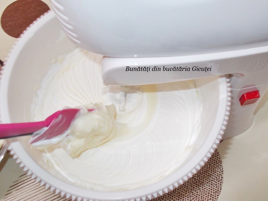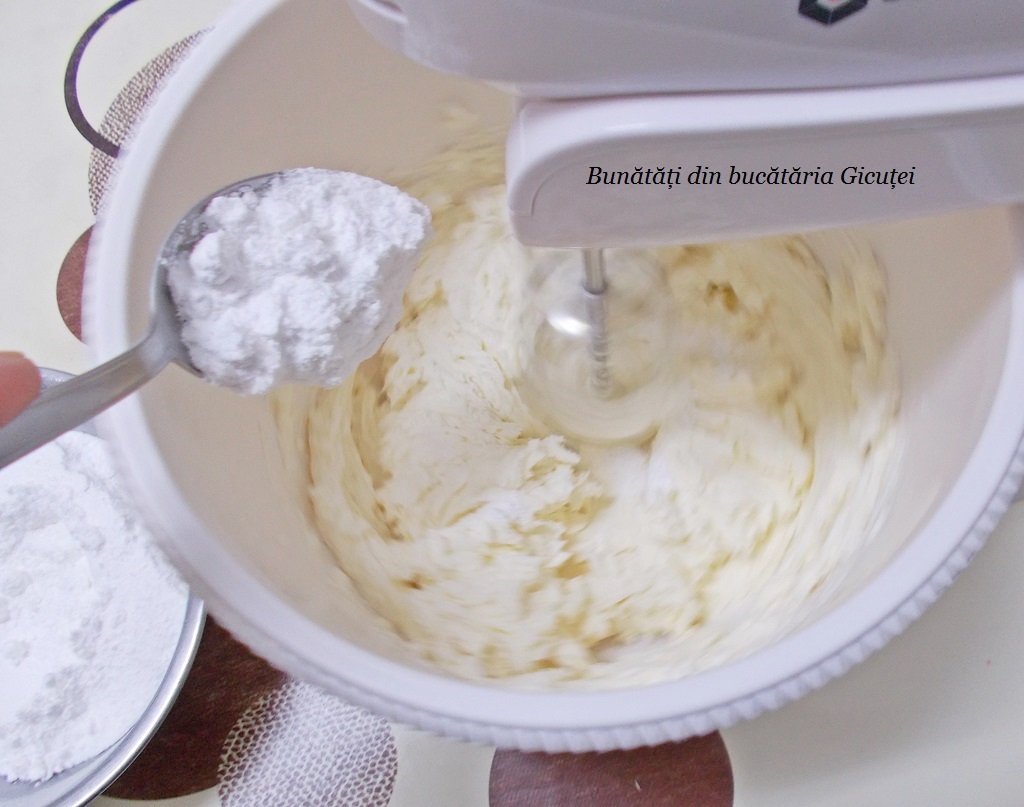 Punem branza mascarpone intr-un bol, adaugam zaharul pudra si o mixam 2-3 minute.