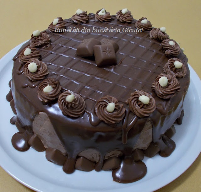 După acest timp, scoatem tortul și îndepărtăm inelul. Crema oprită o întindem pe marginile tortului, de jur împrejur, acoperind în întregime blatul. Ornăm pe margini și deasupra cu bucăți de ciocolată și pastă de zahăr, după imaginația fiecăruia. Delicios… și drăguţ, nu-i așa? 😊