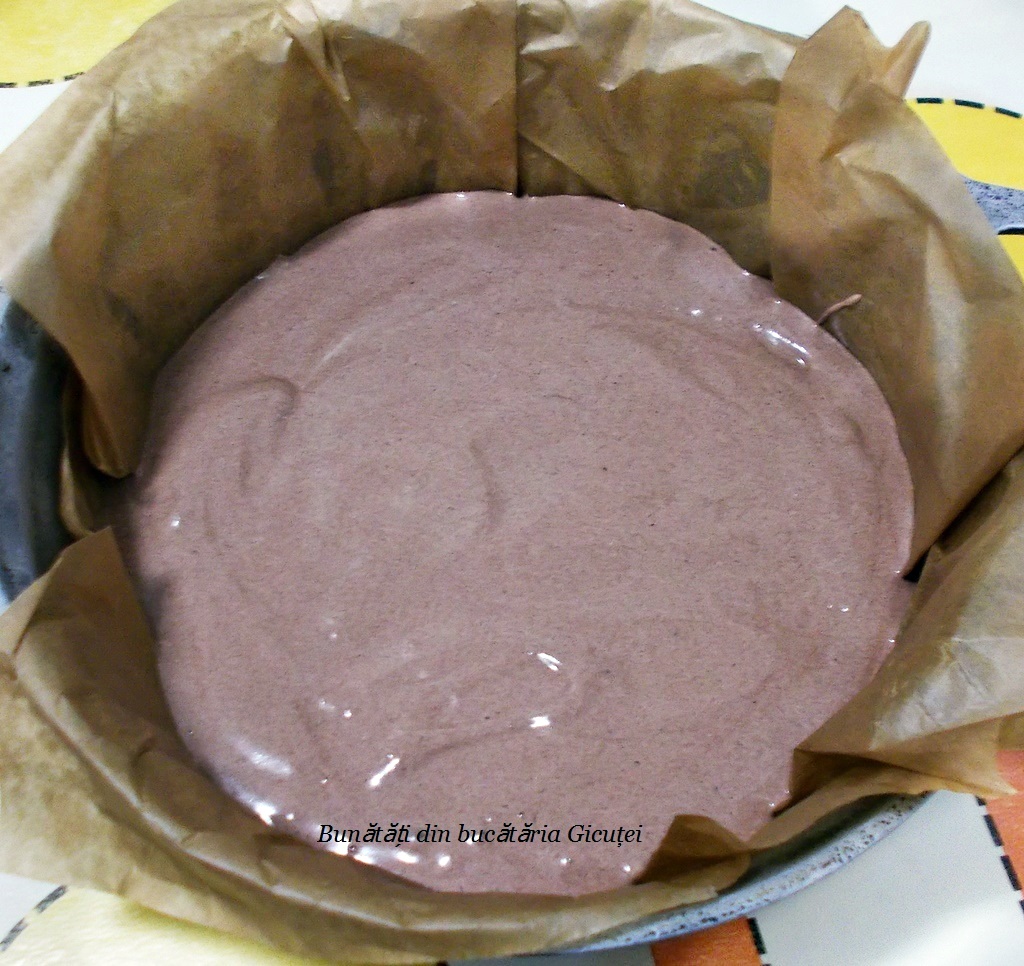Albușurile le mixăm spumă cu un praf bun de sare și le încorporăm ușor, cu o spatulă, în compoziția de gălbenușuri. Tapetăm o formă rotundă cu diametrul de 24 cm (eu am folosit o cratiță) cu hârtie de copt, turnăm compoziția, nivelăm și o dăm la cuptorul preîncălzit, la foc mediu, pentru aproximativ 30-35 de minute. După primele 30 de minute putem face testul cu scobitoarea: înfigem o scobitoare în mijlocul blatului, iar dacă iese curată, fără aluat prins de ea, înseamnă că blatul este copt. Dacă pe scobitoare rămân urme de aluat, mai lăsăm blatul cinci minute îi cuptor, apoi repetăm testul. Când este gata, scoatem blatul din formă și îl lăsăm să se răcească.