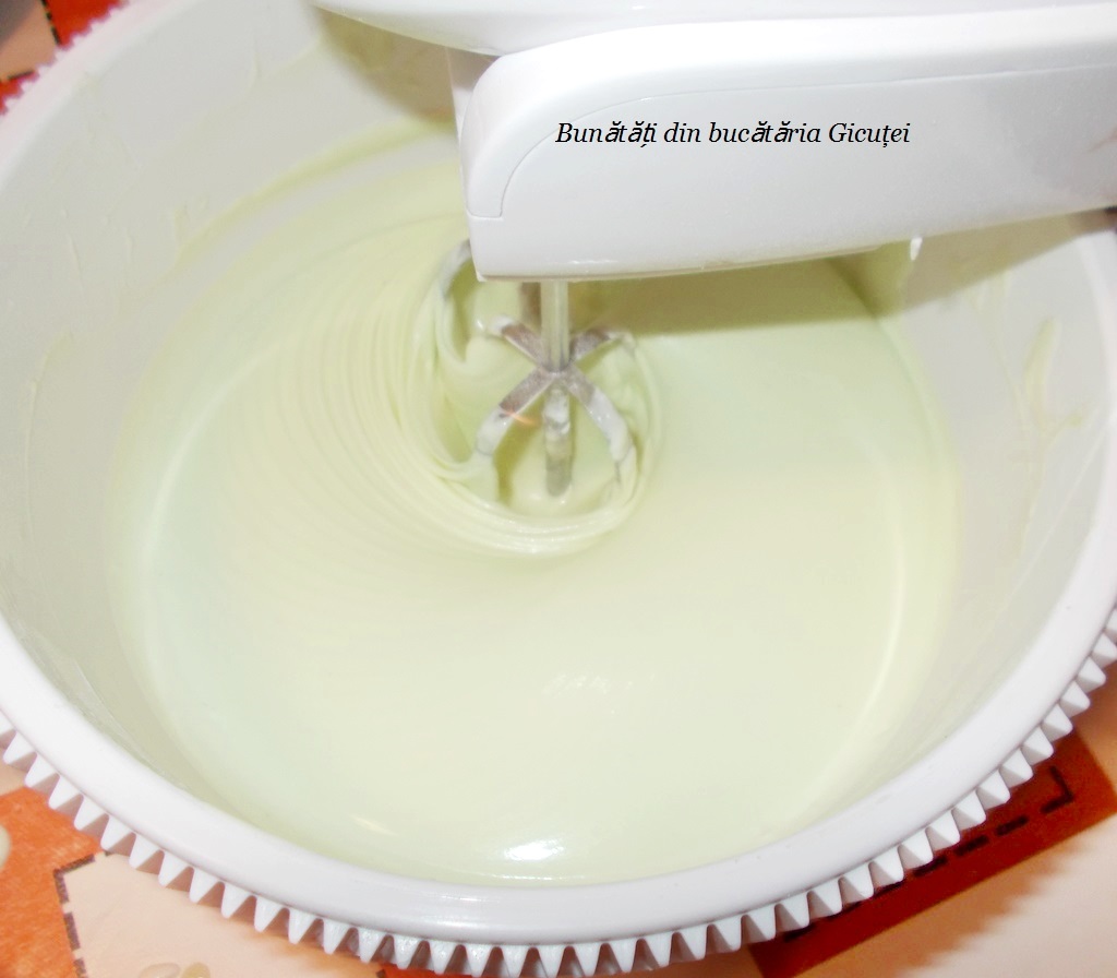 Lăsăm compoziția să se răcească până ajunge la temperatura camerei, apoi, cu ajutorul mixerului, încorporăm sosul în frișca bătută (frișca trebuie să fie foarte rece când o mixăm). Spre sfârșit, adăugăm lingură cu lingură siropul de mentă și mixăm la viteză mică după fiecare.