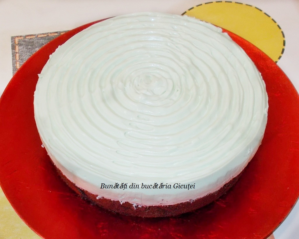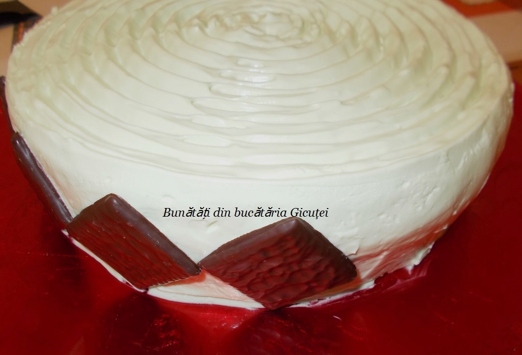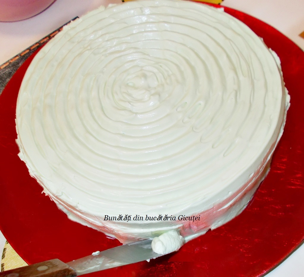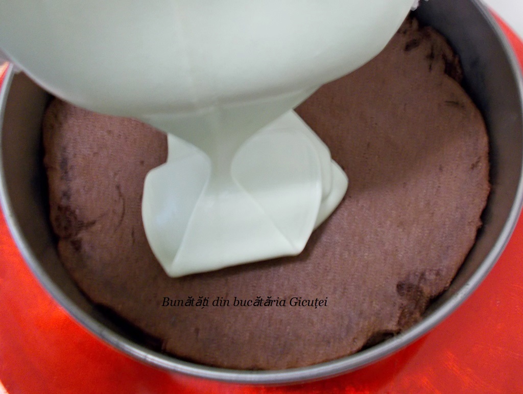 Asamblare: Așezăm blatul pe un platou, punem un inel al unei forme detașabile în jurul lui și îl însiropăm. Oprim 4-5 linguri din cremă, iar restul o turnăm deasupra blatului şi o nivelăm frumos. Dăm tortul la frigider pentru 2-3 ore sau până când se întărește crema.