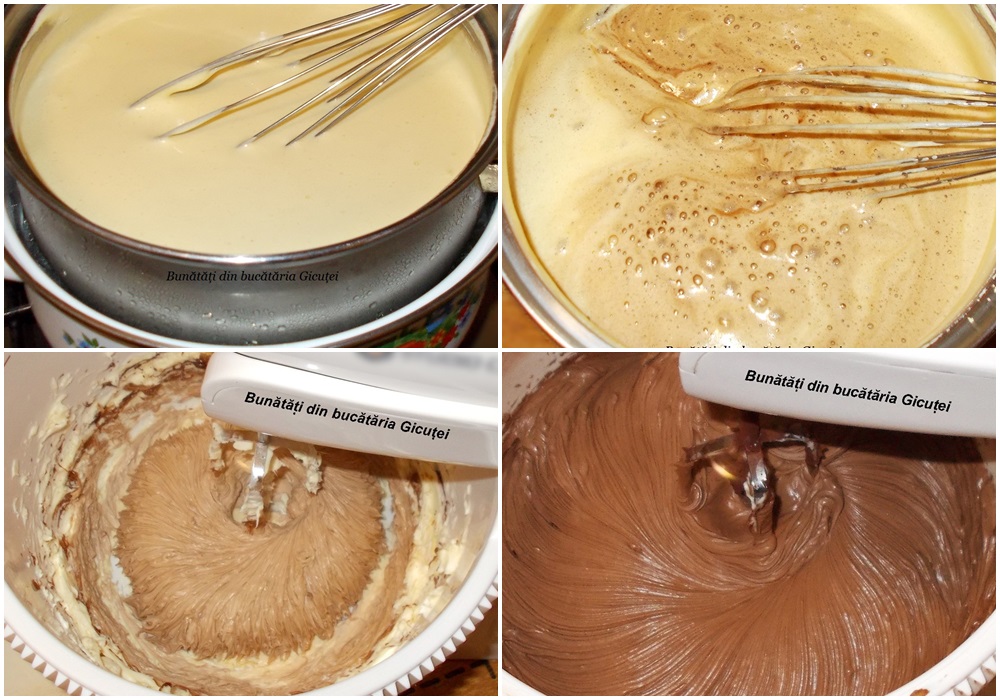 Crema: Mixăm ouăle cu zahărul până se fac ca o cremă deschisă la culoare, apoi le fierbem pe baie de aburi, amestecând mereu până se îngroașă ca o budincă. Luăm de pe foc, punem ciocolata ruptă bucățele și amestecăm bine până se topește. După ce s-a răcit complet, o încorporăm treptat în untul bătut spumă. Punem și cacaoa, esența preferată și gata bunătatea de cremă!