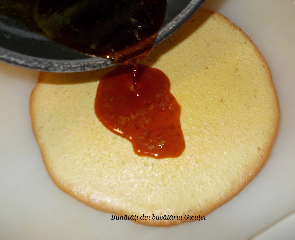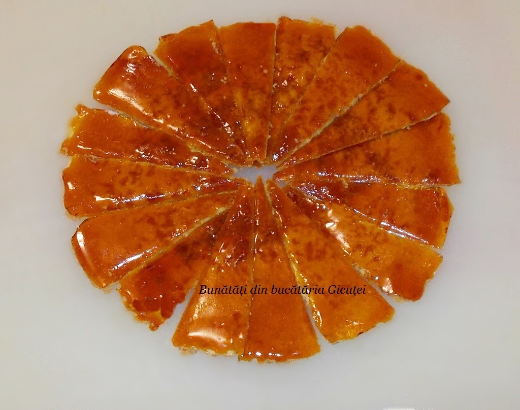 Caramelul: Topim zahărul la foc mic, cu mare grijă să nu se ardă (că devine amar). Când e lichid și auriu, punem un strop de oțet și turnăm imediat peste foaia păstrată. Întindem repede și, după un minut, tăiem foaia în 16 triunghiuri egale cu un cuțit uns cu unt. Trebuie să ne mișcăm repede până nu se întărește caramelul de tot!