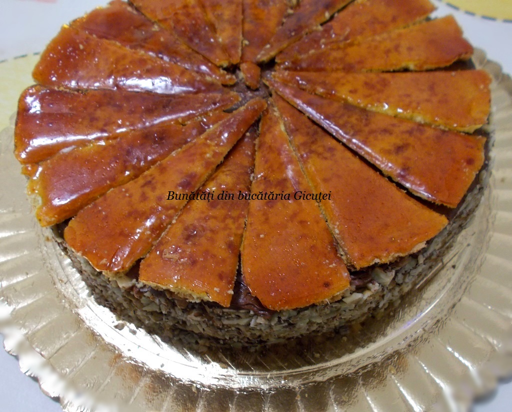 Asamblarea: Punem cremă între foi, dar păstrăm câteva linguri și pentru a îmbrăca tortul pe exterior. Tapetăm marginile cu nucă sfărâmată, iar deasupra așezăm frumos triunghiurile cu caramel. Pentru un aspect de cofetărie, putem trasa dungi subțiri de ciocolată pe marginea feliilor de caramel și punem puțină nucă în mijloc.