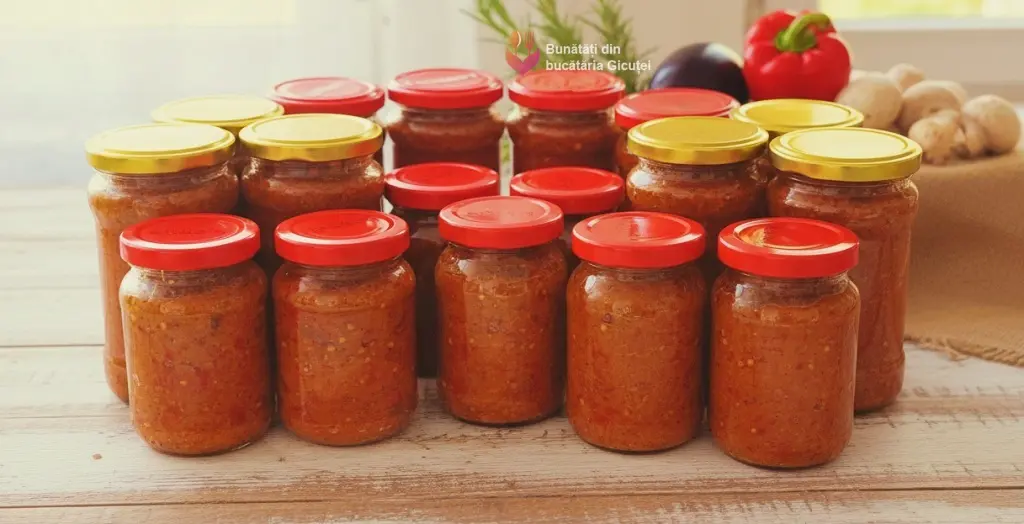 Avem grijă să amestecăm în zacuscă ca să nu se lipească legumele de fundul vasului. Când zacusca este fiartă, vom observa că uleiul începe să iasă la suprafața legumelor. Când este gata, o lăsăm puțin să se răcorească, îndepărtăm frunzele de dafin și punem zacusca în borcanele sterilizate.