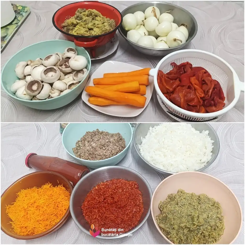 Curățăm ceapa de coajă, o spălăm, apoi o tăiem mărunt. Curățăm ciupercile și piciorușele acestora, iar dacă este cazul le trecem sub jet de apă rece. Morcovul îl curățăm de coajă și îl dăm pe răzătoarea fină. Trecem prin mașina de tocat, ciupercile, ardeii și vinetele. Dacă doriți, le puteți tăia mărunt.