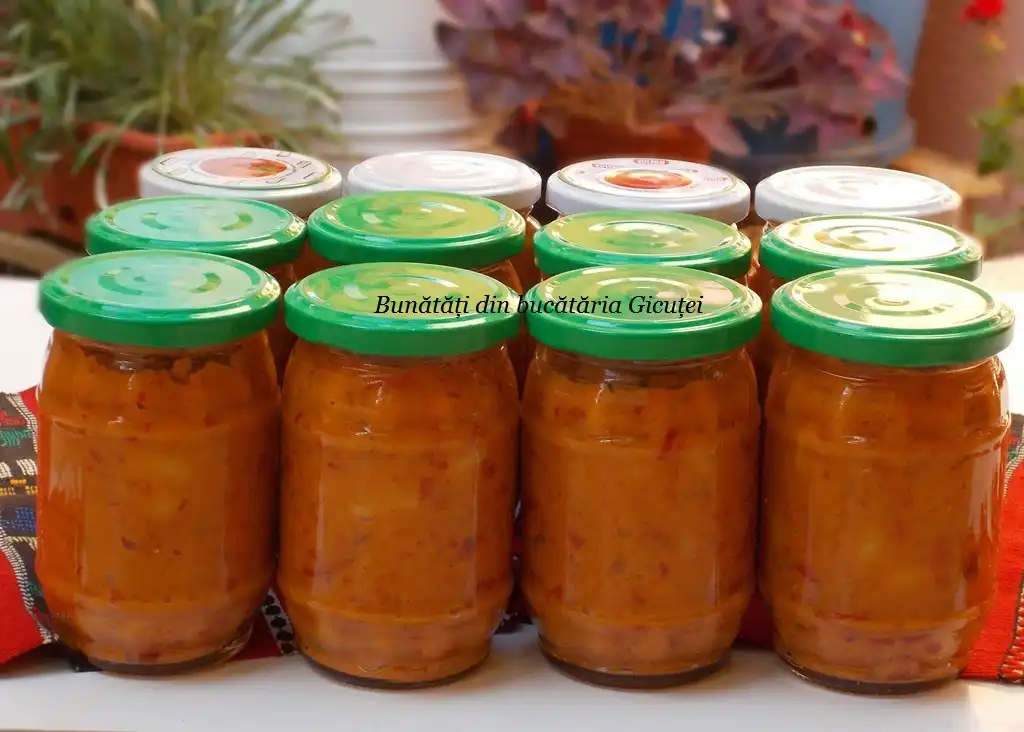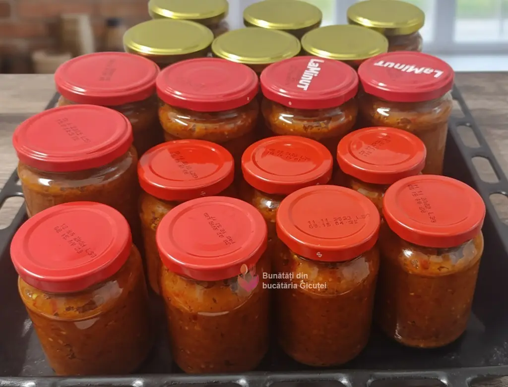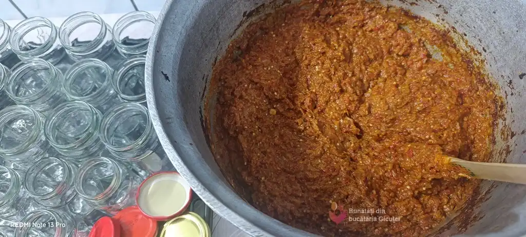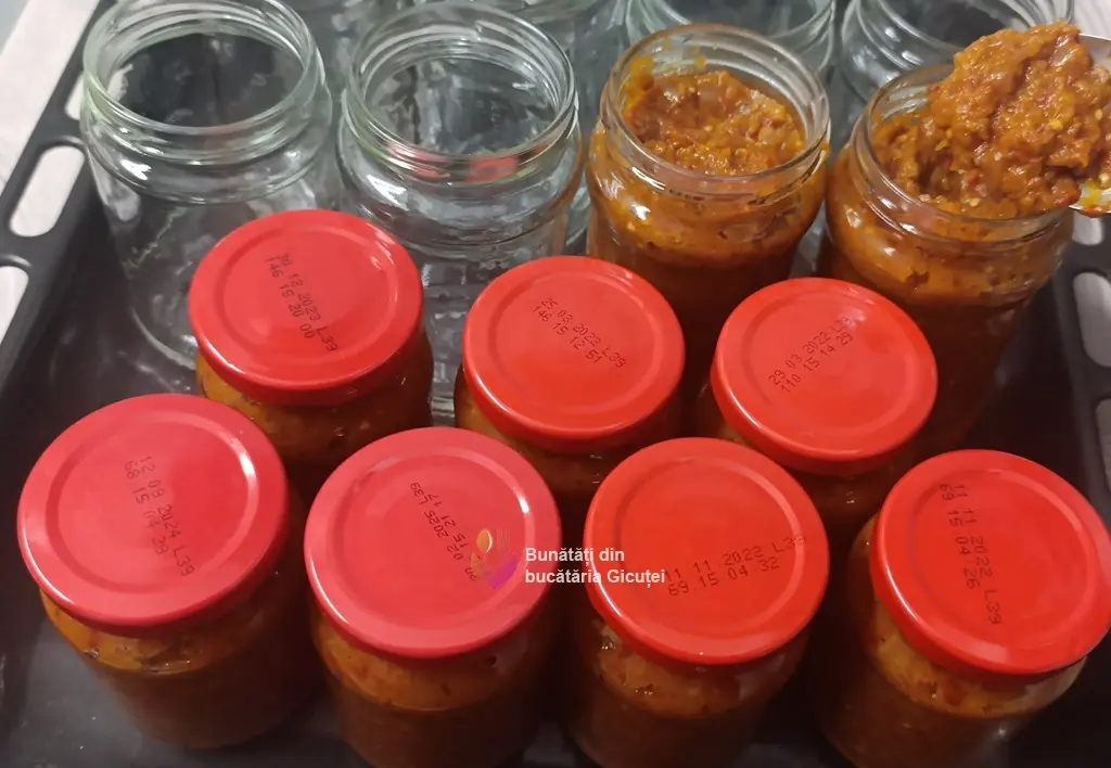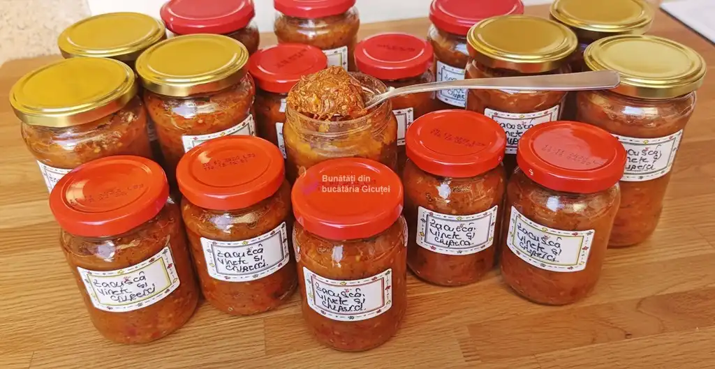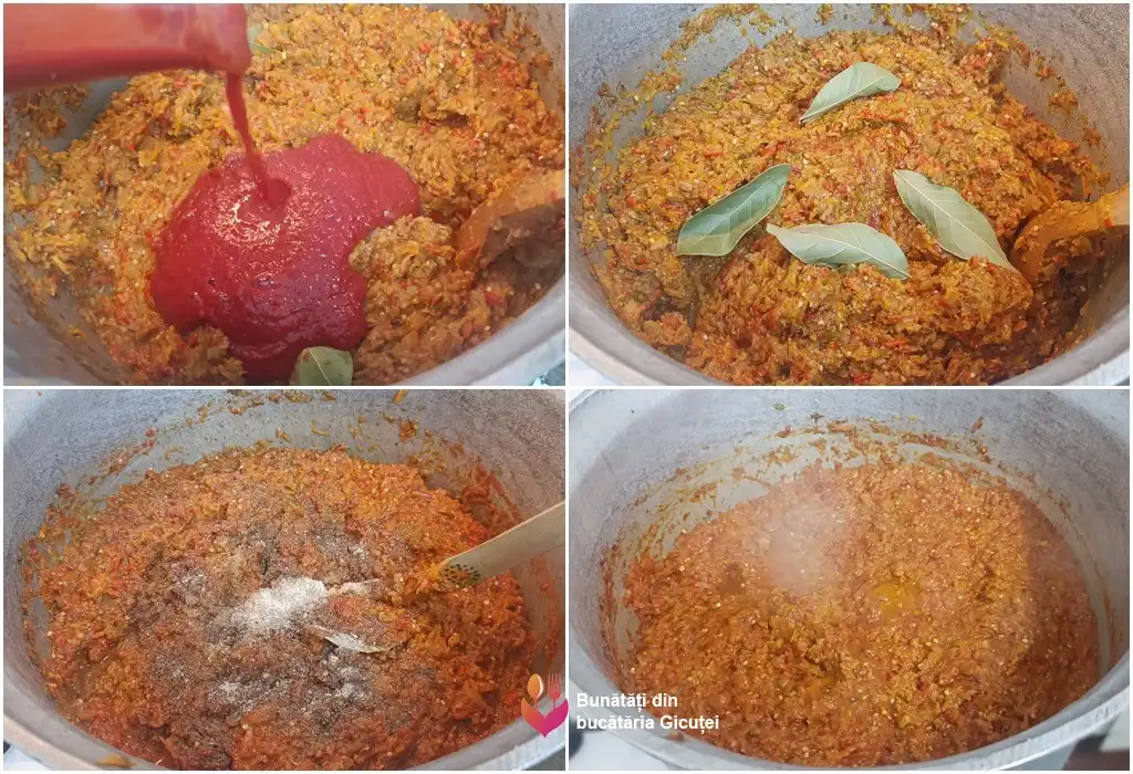 Avem grijă să amestecăm în zacuscă ca să nu se lipească legumele de fundul vasului. Când zacusca este fiartă, vom observa că uleiul începe să iasă la suprafața legumelor. Când este gata, o lăsăm puțin să se răcorească, îndepărtăm frunzele de dafin și punem zacusca în borcanele sterilizate.