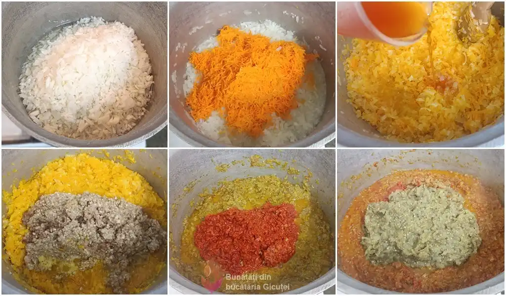 Alegem un vas încăpător cu fundul gros și punem în el uleiul la încins. Când se încinge adăugăm ceapa și ½ linguriță sare. După cca 1 minut punem aproximativ 100 ml din zeama care și-au lăsat-o ardeii. Amestecăm, lăsăm ceapa la înăbușit 7-8 minute, apoi adăugăm morcovul ras. Mai turnăm zeama de la ardei, iar când legumele se înmoaie punem ardeiul, amestecăm din nou și când compoziția începe să clocotească punem vinetele. După 10 minute de fierbere adăugăm passata (suc gros) de roșii, frunzele de dafin și usturoiul dat pe răzătoarea fină. Condimentăm cu sare și piper măcinat, apoi transferăm vasul în cuptor.