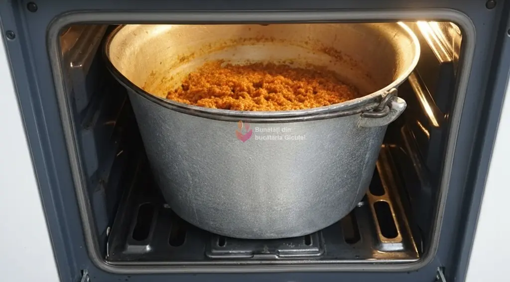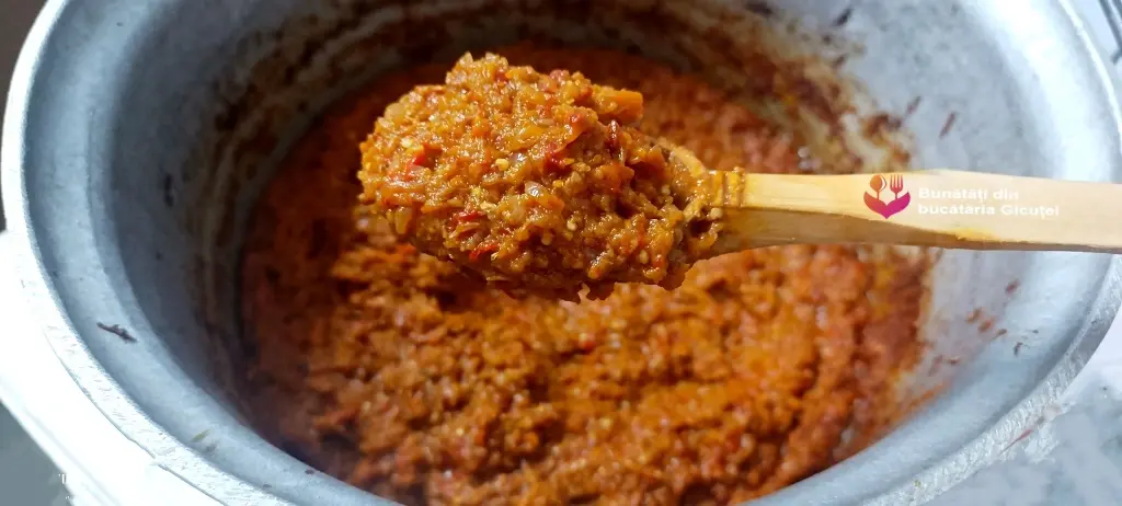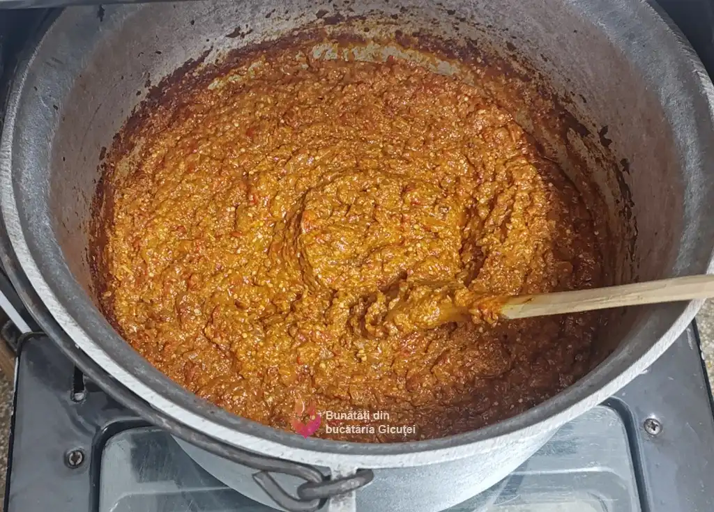 Lăsăm zacusca să fiarbă la foc mic aproximativ o oră și jumătate. Timpul de fierbere depinde de vasul în care facem zacusca: dacă am ales un vas mai larg, zacusca va fierbe mai repede, iar dacă avem unul mai înalt, timpul de gătire va fi mai mare. Dacă doriți, puteți continua gătirea pe aragaz, nu în cuptor, dar eu recomand cuptorul.