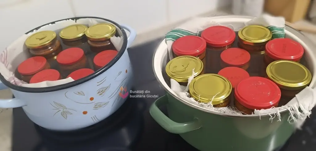 Închidem borcanele cu capace și le așezăm într-o oală/cratiţă(sau doua), în care așternem un prosop de bucătărie, o lavetă curată sau mai multe straturi de hârtie. Turnăm apă rece până aproape de capacele borcanelor, punem oala pe foc mediu și lăsăm să fiarbă. Când apa începe să clocotească reducem focul și continuăm să fierbem borcanele timp de 45 de minute. Lăsăm borcanele să se răcească în apa în care au fiert, acoperite cu un prosop gros sau un capac pus peste cratiță, apoi le scoatem, le ștergem și le depozităm în cămară sau beci. Bunatate!