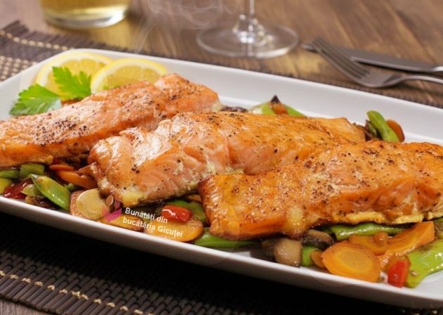 Somon la cuptor cu garnitură de legume